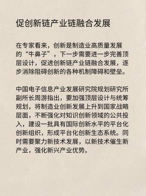在专家看来,创新是制造业高质量发展的“牛鼻子”,下一步需要进一步完善顶层设计,促进创新链产业链融合发展,逐步消除阻碍创新的各种机制障碍和壁垒。