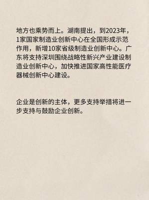 地方也乘势而上。湖南提出,到2023年,1家国家制造业创新中心在全国形成示范作用,新增10家省级制造业创新中心。广东将支持深圳围绕战略性新兴产业建设制造业创新中心,加快推进国家高性能医疗器械创新中心建设。
