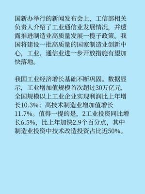 国新办举行的新闻发布会上,工信部相关负责人介绍了工业通信业发展情况,并透露推进制造业高质量发展一揽子政策。我国将建设一批高质量的国家制造业创新中心,工业、通信业进一步开放措施有望加快落地。 我国工业经济增长基础不断巩固。数据显示,工业增加值规模首次超过30万亿元,全国规模以上工业企业实现利润比上年增长10.3%;高技术制造业增加值增长11.7%。值得一提的是,2工业投资同比增长6.5%,比上年加快2.9个百分点,其中制造业投资中技术改造投资占比近50%。
