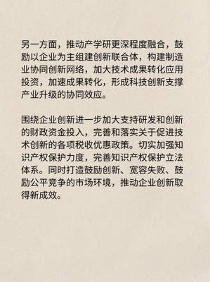 企业的创新活力需要进一步激发。一方面,要坚持以市场为导向,强化企业创新主体地位,对创新型企业的研究开发、政府采购、风险投资、税收优惠、专利申报等给予更多政策支持,引导和促进各类创新要素向企业集聚;另一方面,推动产学研更深程度融合,鼓励以企业为主组建创新联合体,构建制造业协同创新网络,加大技术成果转化应用投资,加速成果转化,形成科技创新支撑产业升级的协同效应。