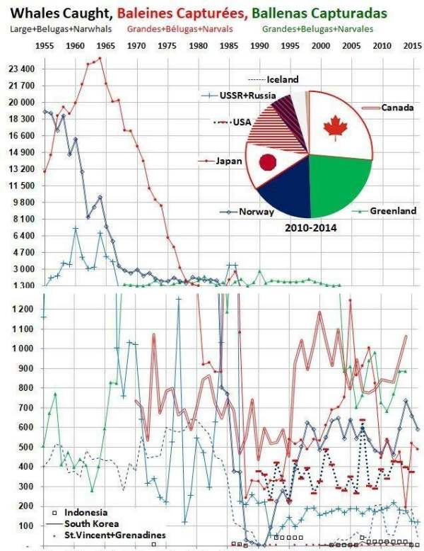 如下图所示,日本捕鲸的数量在1965年附近达到巅峰,随后快速下降。同时,有消息称,日本本身存储有大量的冷冻鲸鱼肉,所以吃鲸鱼肉不是日本捕鲸的根本动力。