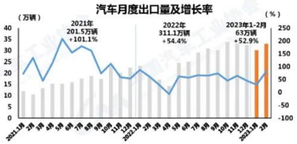根据中汽协的数据,1-2月汽车出口63万辆,其中乘用车52.2万辆,同比增长57.7%;新能源车出口17万辆(新能源乘用车占据95%),同比增长62.8%。显然,金额增速比数量增速快,反映了单价在提升。