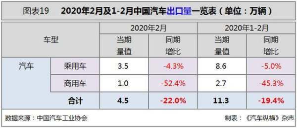据中汽协统计数据显示,2月,汽车企业出口4.5万辆,环比下降35.1%,同比下降22.0%;分车型看,乘用车本月出口3.5万辆,环比下降32.7%,同比下降4.3%;商用车出口1.0万辆,环比下降42.4%,同比下降52.4%。1-2月,汽车企业出口11.3万辆,同比下降19.4%;分车型看,乘用车出口8.6万辆,同比下降5.0%;商用车出口2.7万辆,同比下降45.3%。(见图表19)