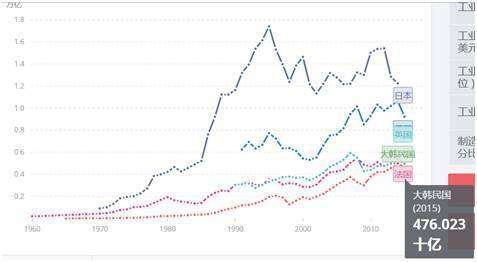 可以看到韩国2015年工业增加值为4760.23亿美元,低于英国当年的4949.2亿美元,低于加拿大的4978亿美元(世界银行只有加拿大2013年数据)。