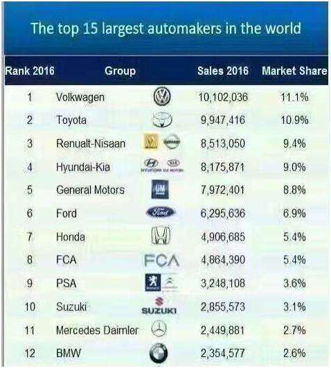 2016年,韩国现代起亚合计销量817.6万辆,销量超过本田,通用,福特,位居世界第四位,占世界市场的9%。
