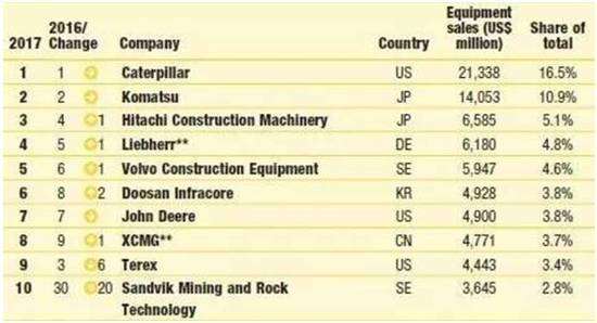 2016年韩国斗山机械在世界工程机械排名第6位,世界市场份额3.8%。