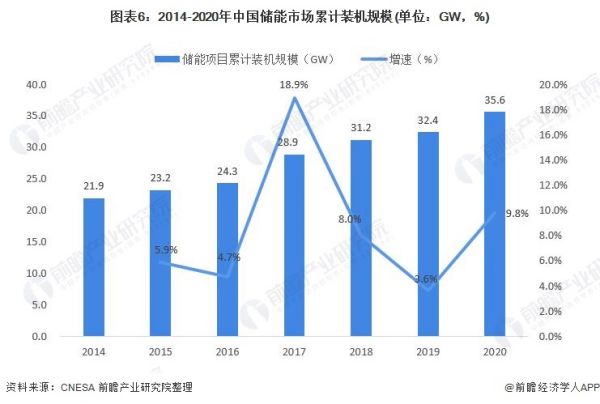 在政策的推动下,我国储能项目装机规模稳步增长。据中关村储能产业技术联盟(CNESA)数据,截至2020年底,我国已投运储能项目累计装机规模为35.6GW,占全球市场总规模的18.6%,同比增长9.8%。