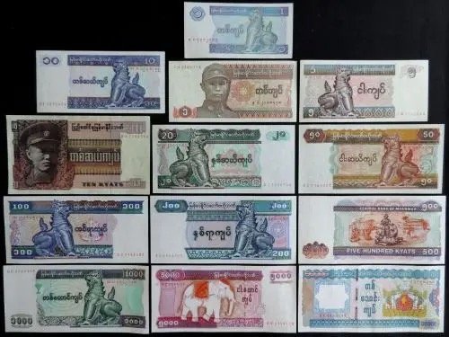 纸币面额有50分和1、5、10、20、50、100、200、500、1000、5000和10000缅元。(其中,5000缅元纸币于2009年10月1日起发行,虽然为缅甸银行历史上发行面值最大的纸币,但其实际价值仍低于5美元。)