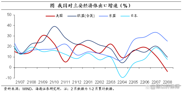 分类来看,对主要经济体出口表现继续分化。8月我国对美国出口增速大幅转负,为2020年5月以来首次转负,是出口增速的主要拖累,或与美国货币政策持续收紧,耐用品需求逐步回落有关。对欧洲、东盟以及日本等出口增速也有所回落,相对来说对东盟出口仍保持高增长。