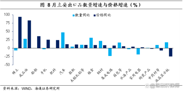另一方面,或与价格贡献有所走弱有关。根据海关总署公布的主要商品出口数量和金额数据来看,多数商品价格增速仍然高于商品数量增速,表明价格因素仍然贡献较高,尤其是稀土、成品油以及船舶等。不过价格贡献有所走弱,7月出口价格增速为14.3%,较6月下滑1.4个百分点。我们预计,8月出口价格增速或继续下滑至13.0%左右,出口数量增速则再度转负。
