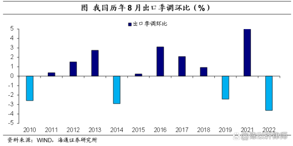 出口环比跌幅扩大。美元计价下,2022年8月我国出口金额同比增长7.1%,较上一月大幅回落10.9个百分点,为4月以来最低。从季调环比来看,8月出口季调环比跌幅扩大为-3.6%,连续2个月环比为负。