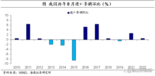 内需仍然较弱。美元计价下,2022年8月我国进口总额同比回落至0.3%,较上一月回落了2.0个百分点。从季调环比来看,8月进口季调环比转正至0.5%,但绝对水平仍然弱于5月和6月。