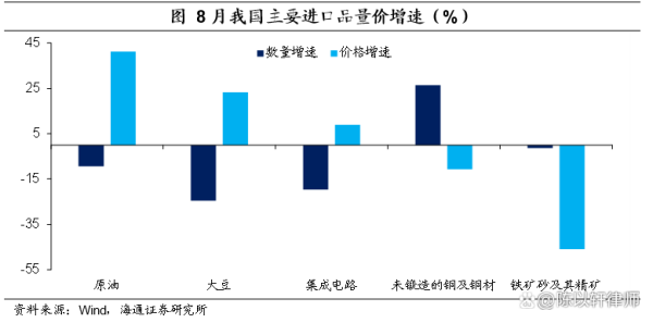 8月除未锻造的铜及铜材外,主要进口品的进口数量同比均为负,尤其是大豆跌幅扩大至-24.5%;而原油、大豆以及集成电路等进口价格仍然保持高增长。而铁矿砂量价齐跌的现象仍在持续。