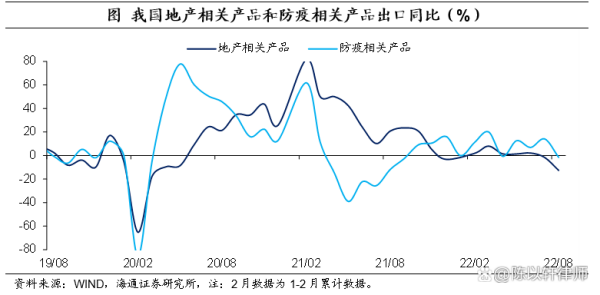 此外,我国防疫相关产品以及地产相关产品出口增速延续回落,尤其是地产相关产品出口增速跌幅扩大至-12.6%,这主要与海外房地产销售持续降温有关。