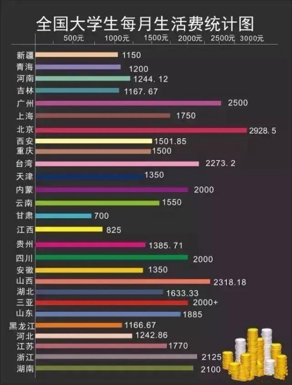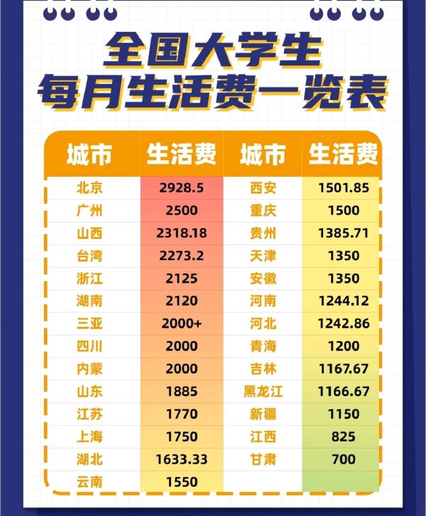 这是一份2019年统计的大学生生活费情况,全国的数据都在上面,大家可以参照一下,生活费较高的有北京,广州,但大多数都是集中在1500元左右,少的也有,像甘肃和江西,月生活费都没有超过1000元。