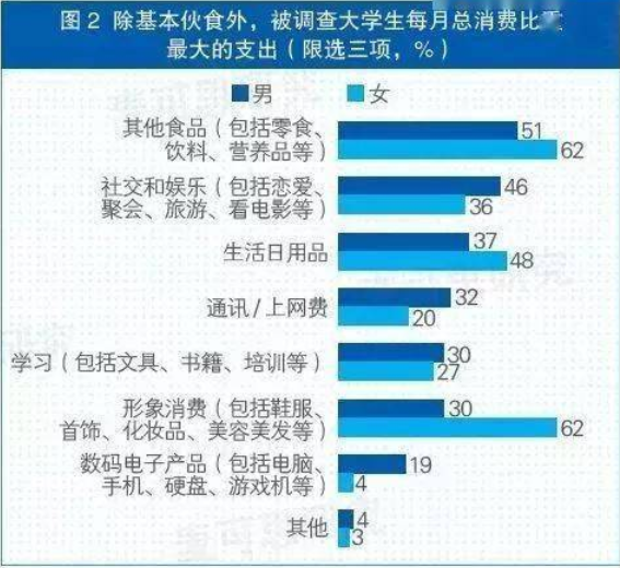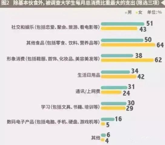 大学生生活费开支的大头主要是社交和娱乐项目,占到了几乎是50%,男生比女生要高一点,另外零食,饮料等支出也占了很大一部分,还有自我形象方面的支持也有很多,这三个大项目是生活费的主要去向。