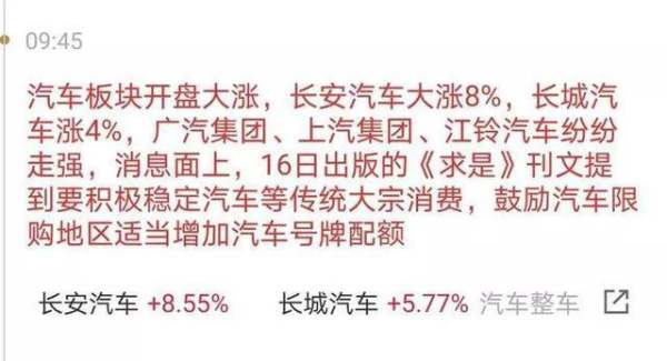 笔者注意到,今日股市汽车板块开盘大涨,长安汽车涨停,领涨汽车板块。其中原因之一是近日出版的《求是》刊文提到要积极稳定汽车等传统大宗消费,并鼓励汽车限购地区适当增加汽车号牌配额。这意图很明显:就是要鼓励汽车消费。