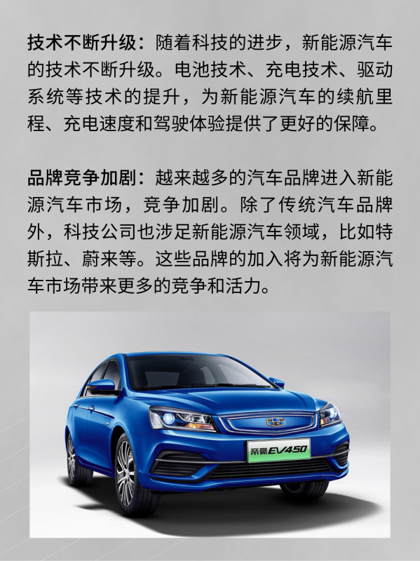 技术不断升级:随着科技的不断进步,新能源汽车的技术不断升级。电池技术、充电技术、驱动系统等技术的提升,为新能源汽车的续航里程、充电速度和驾驶体验提供了更好的保障。