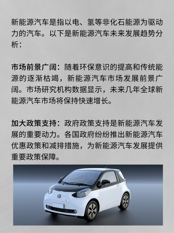 新能源汽车是指以电、氢等非化石能源为驱动力的汽车。以下是新能源汽车未来发展趋势分析: