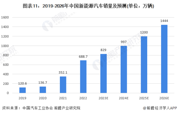 根据中国汽车工业协会统计数据显示,中国新能源汽车销量保持快速增长,2021-2022年我国新能源汽车销量爆发式增长,2022年中国新能源汽车销量达到688.7万辆,同比增长93.4%,连续8年保持全球第一。预计到2026年中国新能源汽车销量将达到1444万辆。