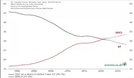 根据IMF的最新估计,2022年新兴市场与发展中经济体GDP增速达3.9%,高于全球3.2%和发达经济体2.4%的经济增速。按购买力平价衡量,新兴市场和发展中经济体经济总量已经占到全球的60%左右,世界经济加速走向多极化。国际货币基金组织发布的《世界经济展望报告》显示,按照购买力平价计算,截至2022年10月,金砖五国在全球GDP中所占份额已经超过了G7