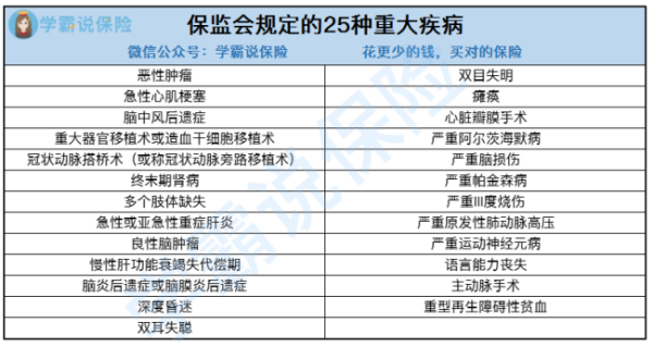 这6种重疾分别是恶性肿瘤、急性心肌梗塞、脑中风后遗症、重大器官移植术或造血干细胞移植术、冠状动脉搭桥术和终末期肾病,在所有人罹患重疾中占比达到80%以上。而25病种,则是在上述6种重疾的基础上,又增加了19种重疾,在所有人罹患重疾中的比例达到95%以上,可以说几乎涵盖了所有高发重疾,因此也被保监会列入重疾险必保的25种疾病。