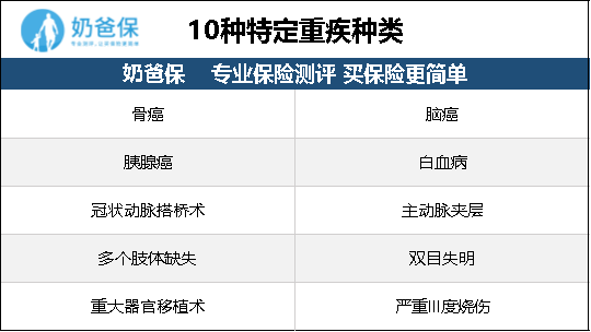 特定疾病保障:10种特定疾病,额外赔付50%保额,最多赔付1次。