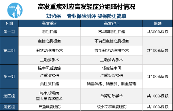 重疾与轻症是同组内共享保额的,并且重疾对应的轻症都会有分组,奶爸列了几个高发疾病的轻重症对应情况: