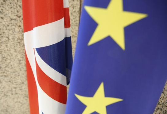 这是2017年3月29日在比利时布鲁塞尔欧盟总部内拍摄的英国国旗和欧盟旗帜。