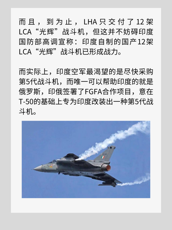 而且,到为止,LHA只交付了12架LCA“光辉”战斗机,但这并不妨碍印度国防部高调宣称:印度自制的国产12架LCA“光辉”战斗机已形成战力。而实际上,印度空军最渴望的是尽快采购第5代战斗机,而唯一可以帮助印度的就是俄罗斯,印俄签署了FGFA合作项目,意在T-50的基础上专为印度改装出一种第5代战斗机。