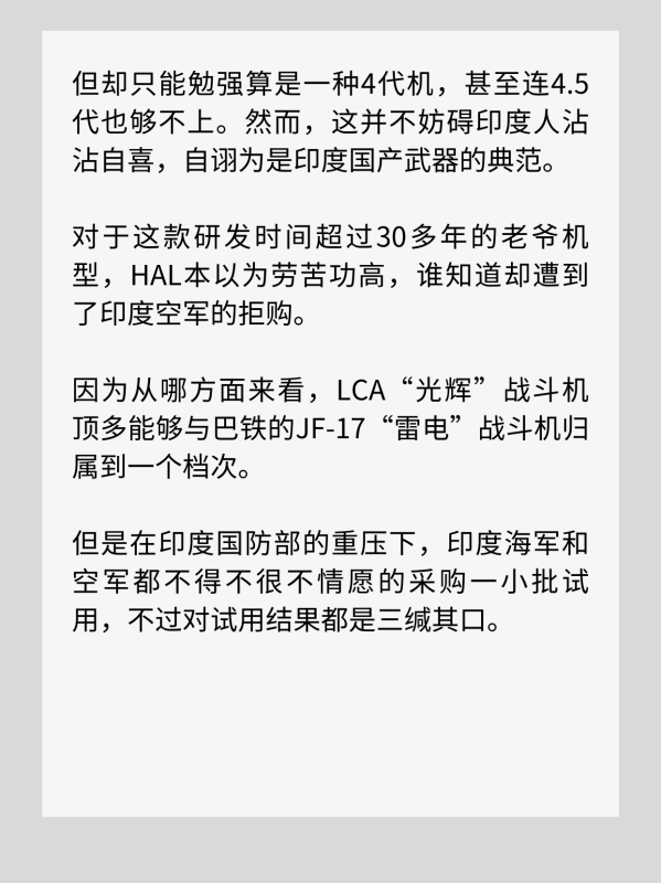 因为从哪方面来看,LCA“光辉”战斗机顶多能够与巴铁的JF-17“雷电”战斗机归属到一个档次。但是在印度国防部的重压下,印度海军和空军都不得不很不情愿的采购一小批试用,不过对试用结果都是三缄其口。