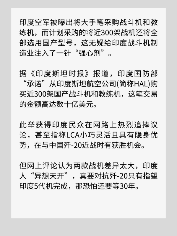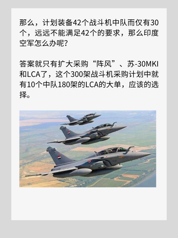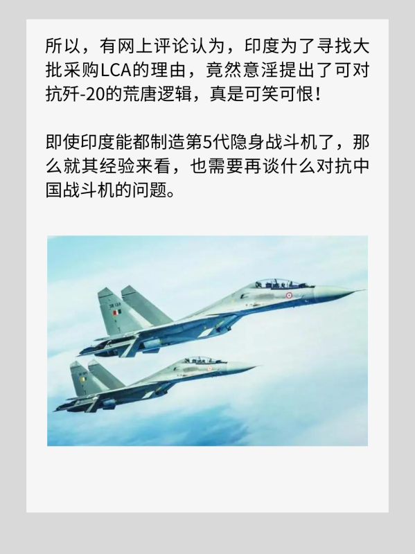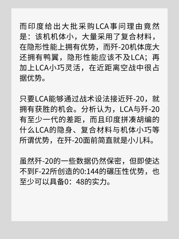 答案就只有扩大采购“阵风”、苏-30MKI和LCA了,这个300架战斗机采购计划中就有10个中队180架的LCA的大单,应该的选择。而印度给出大批采购LCA事问理由竟然是:该机机体小,大量采用了复合材料,在隐形性能上拥有优势,而歼-20机体庞大还拥有鸭翼,隐形性能应该不及LCA;再加上LCA小巧灵活,在近距离空战中很占据优势。