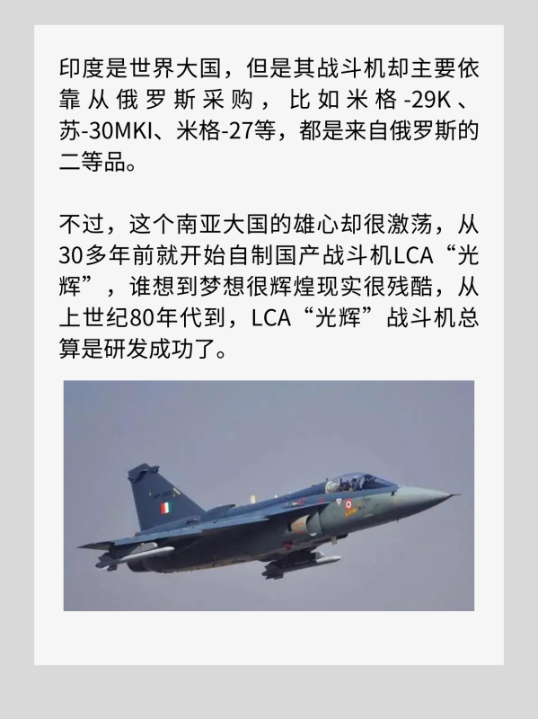 印度是世界大国,但是其战斗机却主要依靠从俄罗斯采购,比如米格-29K、苏-30MKI、米格-27等,都是来自俄罗斯的二等品。不过,这个南亚大国的雄心却很激荡,从30多年前就开始自制国产战斗机LCA“光辉”,谁想到梦想很辉煌现实很残酷,从上世纪80年代到,LCA“光辉”战斗机总算是研发成功了。