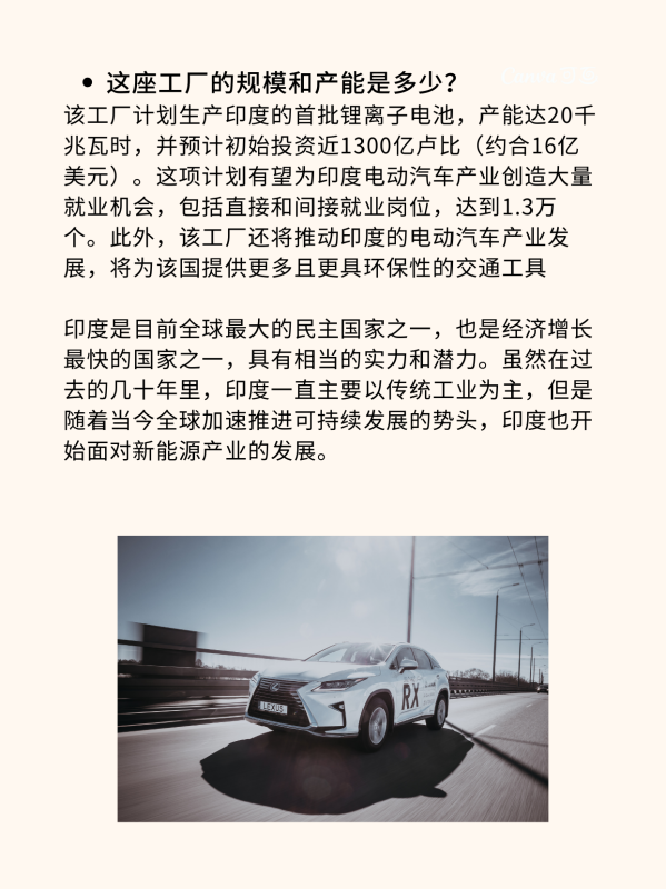 该工厂计划生产印度的首批锂离子电池,产能达20千兆瓦时,并预计初始投资近1300亿卢比(约合16亿美元)。这项计划有望为印度电动汽车产业创造大量就业机会,包括直接和间接就业岗位,达到1.3万个。此外,该工厂还将推动印度的电动汽车产业发展,将为该国提供更多且更具环保性的交通工具