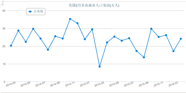 美国2月失业率4.9%,于预期和前值一致。美国2月平均每周工时实际34.4,预期和前值是34.6。路透社评美国2月非农就业报告,2月非农人数大幅好于预期,失业率维持八年低位不变,就业增长主要受零售贸易、食品服务等行业就业驱动;此前全球放缓和金融市场震荡引发对美国经济衰退的担忧,而此次靓丽数据消除人们此类担忧,基于就业市场强劲增长,美联储年内加息指日可待。