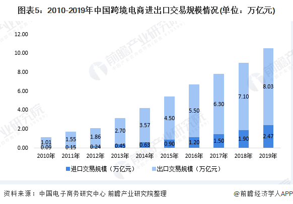 跨境电商是指分属不同关税区的交易主体,通过互联网信息技术完成在线交易洽谈和下单行为,达成交易合同、通过支付机构进行跨境支付结算,并通过跨境物流将商品送达、完成交易的一种国际商务活动。数据显示,2010年以来,我国跨境电商行业的交易规模几乎保持了20%以上的增速,2019年,据中国电子商务研究中心的统计数据显示,我国跨境电商交易规模达10.5亿元,同比增长16.7%。