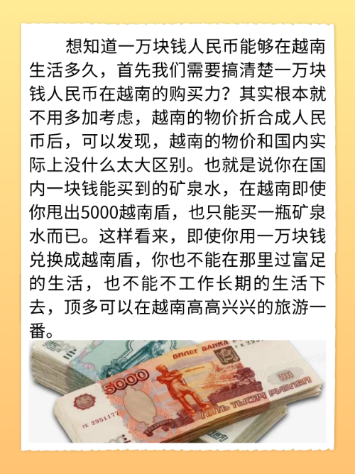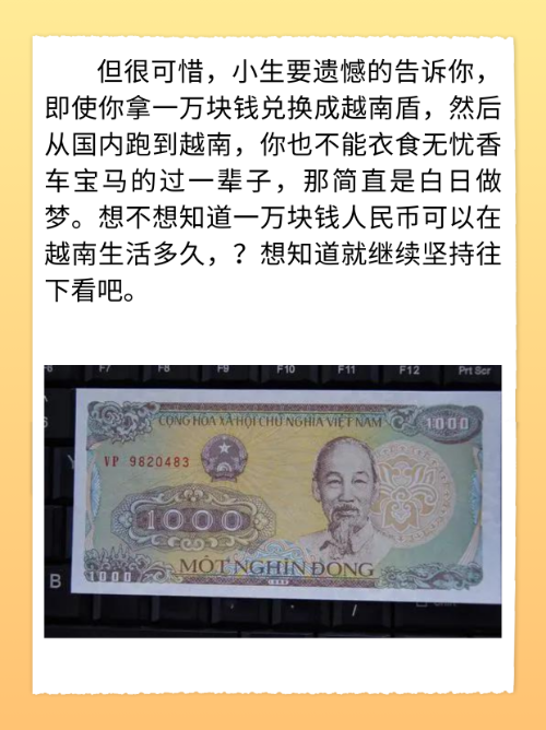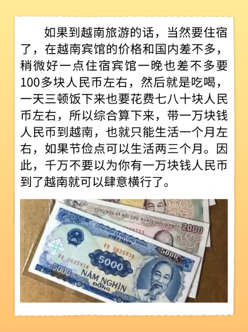 但很可惜,小生要遗憾的告诉你,即使你拿一万块钱兑换成越南盾,然后从国内跑到越南,你也不能衣食无忧香车宝马的过一辈子,那简直是白日做梦。想不想知道一万块钱人民币可以在越南生活多久,?想知道就继续坚持往下看吧。