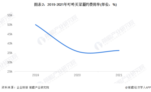生鲜前置仓模式与其他生鲜电商模式最大的不同,就是其在居民小区1.5km左右设立一个面积约100㎡左右的前置仓。前置仓转运、租金(仓)、打包(仓管)、配送(骑手)等运营和环节组成了高履约费用支出,造成生鲜前置仓模式的生鲜电商平台资金链持续紧张。以叮咚买菜为例,2018年-2021年三年间,叮咚买菜的履约费用率分别为49.92%、35.68%、36.14%。叮咚买菜在上市后的履约费用稍有上升,但整体还算平稳。但这也侧面证实,生鲜前置仓的业务增长并不能带来履约费用的降低。