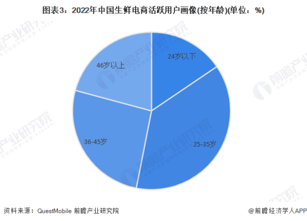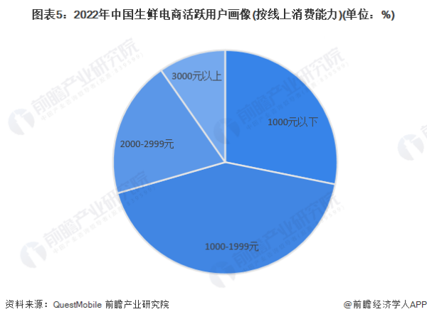 根据QuestMobile统计数据显示,截至2022年7月,生鲜电商主要活跃用户年龄段为25-35岁,占比达到37.6%。从城市等级来看,主要集中在一线及新一线城市,两者共计占比达到59.7%。从线上消费能力来看,大部分消费者以1000-1999元为主,占比超过40%。