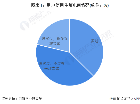 随着我国电子商务的深化发展,生鲜电商的普及度不断提升,生鲜电商普及度逐渐提升,在网上购买过生鲜的用户占被调研用户数量的37.5%。但却有将近半数的用户表示虽然没买过生鲜电商产品,但是未来有兴趣尝试,而这部分用户则是生鲜电商的潜在用户。完全不感兴趣的用户约二成。可见,随着人们消费模式的转变,生鲜电商在用户规模和市场规模上还存在较大增长空间。