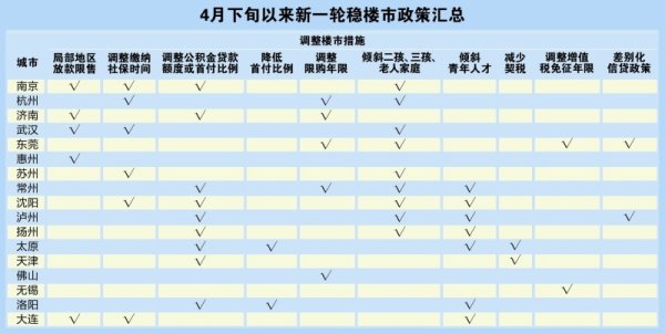 其他城市稳楼市新政也丰富多样,洛阳、上饶、连云港、梅州等城市降低首付比例至二成,株洲、南阳、黄石、岳阳、鹤壁等或契税优惠、或购房补贴财政“托市”;无锡将个人住房转让增值税免征年限由5年调整为2年。