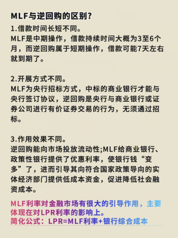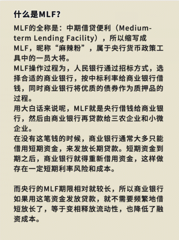 先来说一个知识点:什么是MLF?MLF就是中期借贷便利,这是一种常见的市场货币工具,作用是来维稳市场的流动性。人民银行就是央行,要求商业银行把自身的一些金融抵押物抵押给他,然后央行再供给这些商业银行用来扶持三农企业和小微企业这类指定企业的贷款。这里所谓的中期指的是央行对商业银行的借贷期限,一般是三个月、半年、一年期。