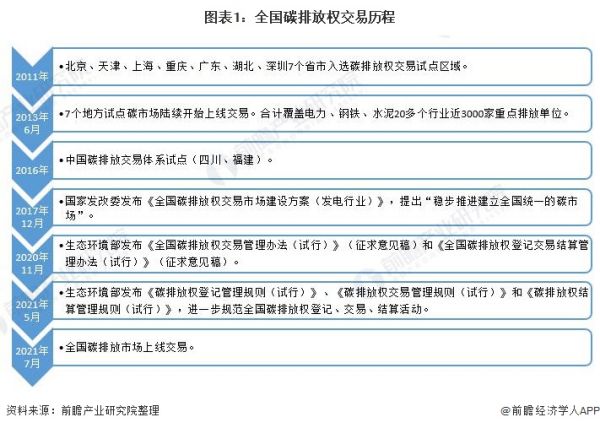 2011年,北京、天津、上海、重庆、广东、湖北、深圳7个省市入选碳排放权交易试点区域;2013年6月,7个地方试点碳市场陆续开始上线交易;2016年,四川、福建开启碳排放交易体系试点;2017年《全国碳排放权交易市场建设方案(发电行业)》,2020年《全国碳排放权交易管理办法(试行)》(征求意见稿)和《全国碳排放权登记交易结算管理办法(试行)》(征求意见稿),2021年《碳排放权登记管理规则(试行)》、《碳排放权交易管理规则(试行)》和《碳排放权结算管理规则(试行)》相继出台,全国统一碳排放权交易市场建设提速。