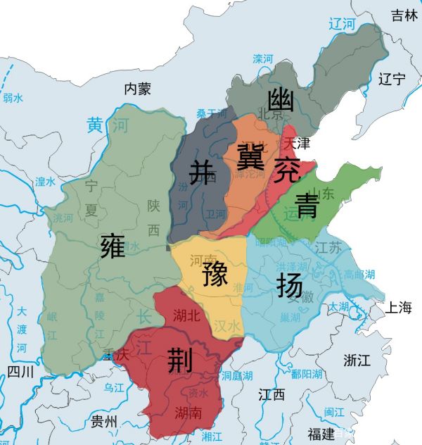 九州指的是九个相当于今天的省吧,分别是:冀州、兖州、青州、徐州、扬州、荆州、豫州、梁州、雍州。