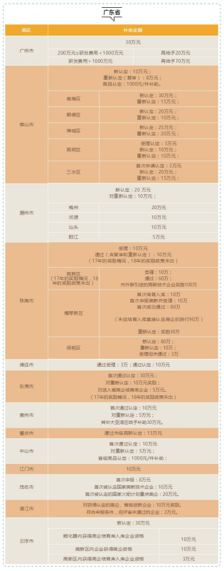 通过高新认定的企业,可以获得市、区两级财政资金支持,以广东高新认定政策为例,小编为各位整理了一份2018年最新广东省内补助金额资料,各位来看看自己的企业能拿多少吧。