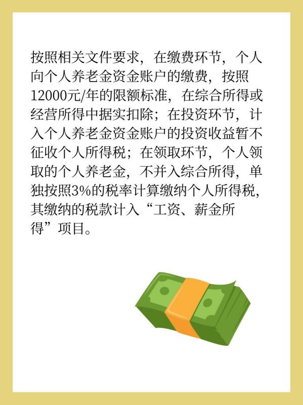 按照相关文件要求,在缴费环节,个人向个人养老金资金账户的缴费,按照12000元/年的限额标准,在综合所得或经营所得中据实扣除;在投资环节,计入个人养老金资金账户的投资收益暂不征收个人所得税;在领取环节,个人领取的个人养老金,不并入综合所得,单独按照3%的税率计算缴纳个人所得税,其缴纳的税款计入“工资、薪金所得”项目。