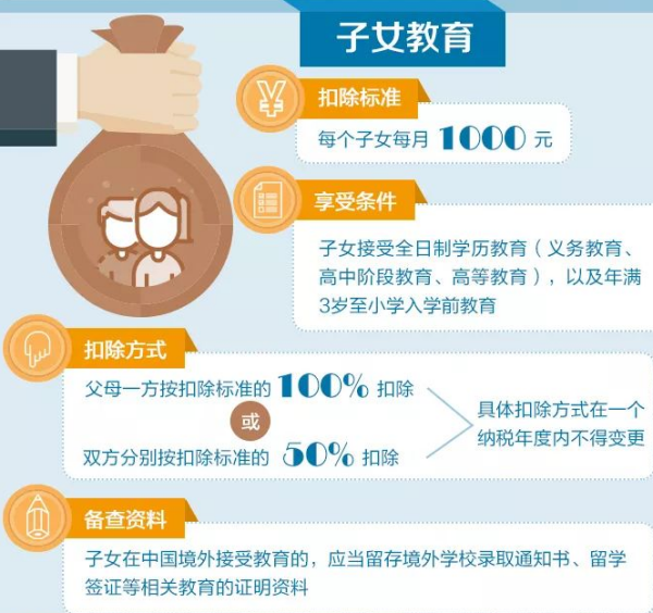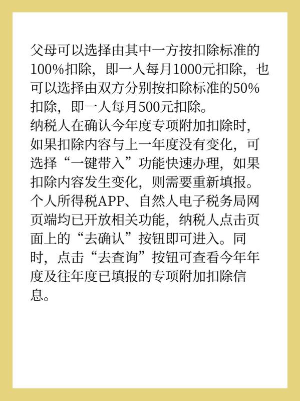 父母可以选择由其中一方按扣除标准的100%扣除,即一人每月1000元扣除,也可以选择由双方分别按扣除标准的50%扣除,即一人每月500元扣除。