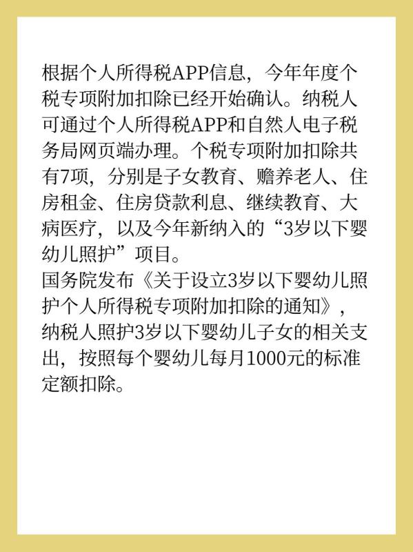 根据个人所得税APP信息,今年年度个税专项附加扣除已经开始确认。纳税人可通过个人所得税APP和自然人电子税务局网页端办理。个税专项附加扣除共有7项,分别是子女教育、赡养老人、住房租金、住房贷款利息、继续教育、大病医疗,以及今年新纳入的“3岁以下婴幼儿照护”项目。