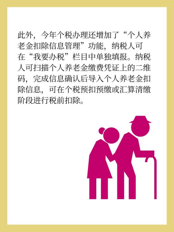 此外,今年个税办理还增加了“个人养老金扣除信息管理”功能,纳税人可在“我要办税”栏目中单独填报。纳税人可扫描个人养老金缴费凭证上的二维码,完成信息确认后导入个人养老金扣除信息,可在个税预扣预缴或汇算清缴阶段进行税前扣除。