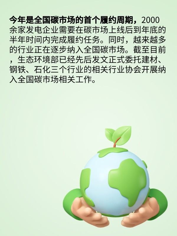 今年是全国碳市场的首个履约周期,2000余家发电企业需要在碳市场上线后到年底的半年时间内完成履约任务。同时,越来越多的行业正在逐步纳入全国碳市场。截至目前,生态环境部已经先后发文正式委托建材、钢铁、石化三个行业的相关行业协会开展纳入全国碳市场相关工作。